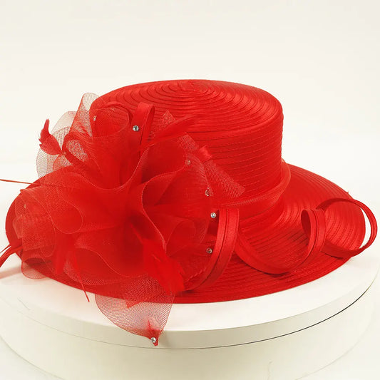Graceful Red Wide Brim Church Hat with Mesh & Feather Trim SD723