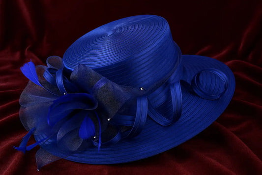 Royal Blue Wide Brim Church Hat with Mesh Flower & Feathers SD723